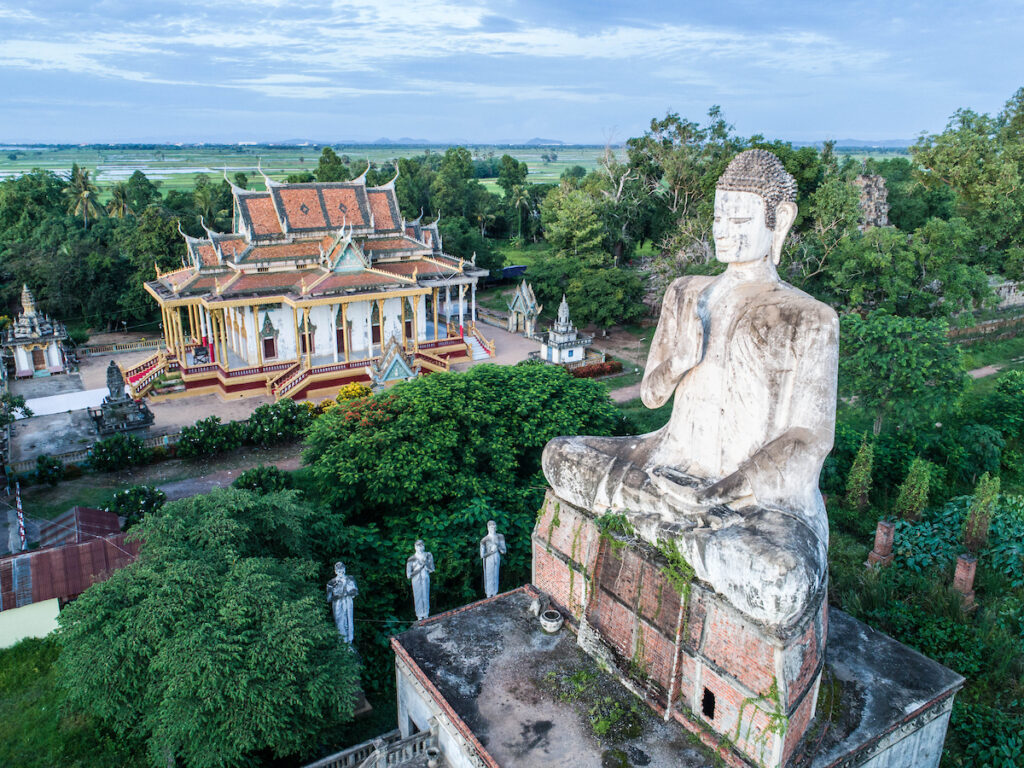 A partly collapsed ancient temple that sits beside a modern pagoda and a large sitting Buddha statue. You can walk through shaded grounds and see carvings that tell stories from many centuries ago.